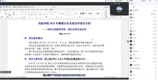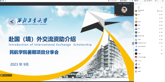 2023年暑期海外交流项目的带队老师代表田薇、和麟,从出国(境)交流项目的申请条件、获资助情况、交流收获及交流期间了解到当地留学申请的条件和优势做了详细的介绍,鼓励同学们尽早明确目标,提前规划,把握出国(境)交流学习的机会。学生代表赵瑨(博士生)、吴沛坤(本科生)分别从自身角度出发,向与会的全体学生分享出国参加此次暑期项目的心得与收获,他们坦言,此次交流不仅让他们了解到国外先进的航空宇航知识,体验了当地的风土人情,更增长了见识,坚定了他们要学好本领、航空报国的决心。