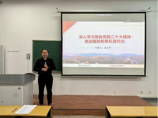 易万军重点围绕党的二十大的主题、过去五年的工作和新时代十年的伟大变革、中国式现代化的特征及本质要求等方面,对党的二十大精神作了深入解读。他重点讲述了实现建军一百年奋斗目标、开创国防和军队现代化新局面等内容,引导学生深入学习了解习近平强军思想和国防军队改革所取得的重大成就和新时代中国人民解放军的使命任务。他表示,同学们作为新时代双一流高校的学生,要坚定不移听党话、跟党走,立志做有理想、敢担当、能吃苦、肯奋斗的新时代好青年,让青春在全面建设社会主义现代化国家的火热实践中绽放绚丽之花。