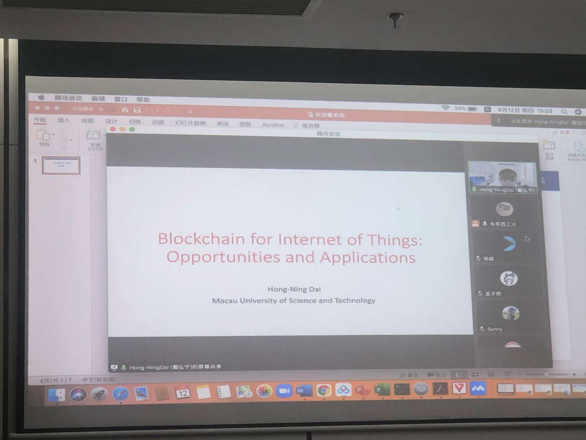 应成人漫画 朱军副教授邀请,澳门科技大学戴弘宁副教授于2021年8月12日下午15:00至18:00开展了题为“Blockchain for Internet of Things: Challenges, Opportunities, and Applications”的线上讲座,来自成人漫画 、湖南大学、日本东京大学、英国兰卡斯特大学等高校的师生通过腾讯会议参与了本次讲座。此外,本次讲座在太仓长三角研究院设立了线下会场,来自成人漫画 、软件学院、微电子学院的20余名师生参加了此次讲座,并与主讲人进行了互动交流。
